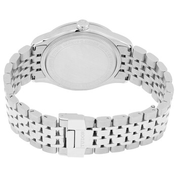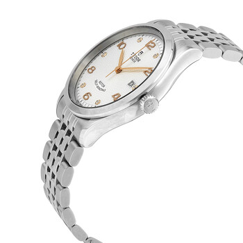 Stainless steel case with a stainless steel bracelet. Fixed stainless steel bezel. Silver dial with rose gold-tone leaf-style hands and alternating Arabic numeral and diamond hour markers. Minute markers around the outer rim. Dial Type: Analog. Date display at the 3 o'clock position. Tudor calibre 2824 automatic movement, based upon ETA 2824, containing 25 Jewels, bitting at 28800 vph, and has a power reserve of approximately 38 hours. Scratch resistant sapphire crystal. Pull / push crown. Solid case back. Round case shape. Case size: 39 mm. Fold over clasp. Water resistant at 100 meters / 330 feet. Functions: date, hour, minute, second. Dress watch style. Watch label: Swiss Made. Tudor 1926 Automatic 39 mm Diamond Silver Dial Men's Watch M91550-0003.