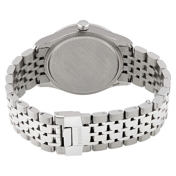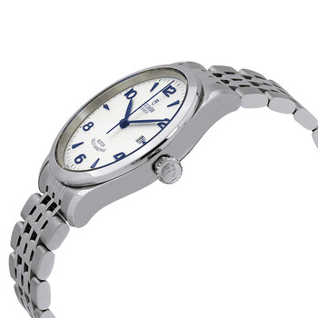 Polished stainless steel case with a stainless steel bracelet. Fixed stainless steel bezel. Opaline dial with blue leaf-style hands and alternating index and Arabic numeral hour markers. Minute markers around the outer rim. Dial Type: Analog. Date display at the 3 o'clock position. Tudor calibre 2824 automatic movement, based upon ETA 2824, containing 25 Jewels, bitting at 28800 vph, and has a power reserve of approximately 38 hours. Scratch resistant sapphire crystal. Screw down crown. Solid case back. Round case shape. Case size: 39 mm. Band width: 21 mm. Fold over clasp with a safety release. Water resistant at 100 meters / 330 feet. Functions: date, hour, minute, second. Casual watch style. Watch label: Swiss Made. Tudor 1926 Automatic 39 mm Opaline Dial Men's Watch M91550-0005.