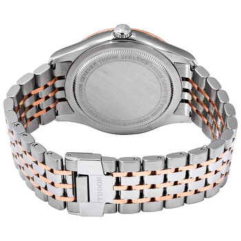 Stainless steel case with a stainless steel bracelet with 18kt rose gold links. Fixed 18kt rose gold bezel. Silver dial with rose gold-tone leaf-style hands and alternating Arabic numeral and index hour markers. Minute markers around the outer rim. Dial Type: Analog. Date display at the 3 o'clock position. Tudor calibre 2824 automatic movement, based upon ETA 2824, containing 25 Jewels, bitting at 28800 vph, and has a power reserve of approximately 38 hours. Scratch resistant sapphire crystal. Screw down crown. Solid case back. Round case shape. Case size: 41 mm. Band width: 20 mm. Fold over clasp with a safety release. Water resistant at 100 meters / 330 feet. Functions: date, hour, minute, second. Luxury watch style. Watch label: Swiss Made. Tudor 1926 Automatic Silver Dial 41 mm Men's Watch M91651-0001.