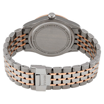 Stainless steel case with a stainless steel bracelet with 18kt rose gold links. Fixed 18kt rose gold bezel. Silver dial with rose gold-tone leaf-style hands and alternating index and Arabic numeral hour markers. Minute markers around the outer rim. Dial Type: Analog. Date display at the 3 o'clock position. Tudor calibre 2824 automatic movement, based upon ETA 2824, containing 25 Jewels, bitting at 28800 vph, and has a power reserve of approximately 38 hours. Scratch resistant sapphire crystal. Screw down crown. Solid case back. Round case shape. Case size: 39 mm. Fold over clasp with a safety release. Water resistant at 100 meters / 330 feet. Functions: date, hour, minute, second. 1926 Series. Casual watch style. Watch label: Swiss Made. Tudor 1926 Automatic Silver Dial Men's 39 mm Watch M91551-0001.