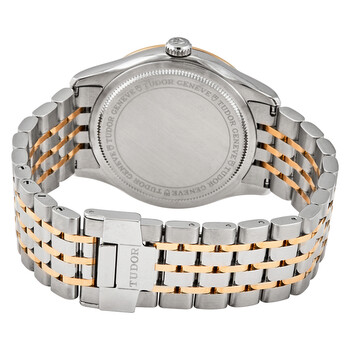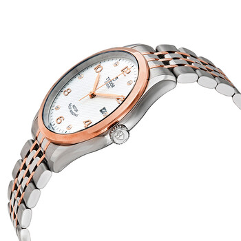 Stainless steel case with a stainless steel bracelet with rose gold links. Fixed rose gold bezel. Silver dial with rose gold-tone leaf-style hands and alternating diamond and Arabic numeral hour markers. Minute markers around the outer rim. Dial Type: Analog. Date display at the 3 o'clock position. Tudor calibre 2824 automatic movement, based upon ETA 2824, containing 25 Jewels, bitting at 28800 vph, and has a power reserve of approximately 38 hours. Scratch resistant sapphire crystal. Screw down crown. Solid case back. Round case shape. Case size: 39 mm. Fold over clasp. Water resistant at 100 meters / 330 feet. Functions: date, hour, minute, second. 1926 Series. Casual watch style. Watch label: Swiss Made. Tudor 1926 Automatic Silver Diamond Dial Men's 39 mm Watch M91551-0002.