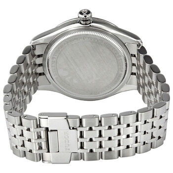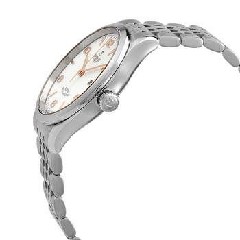 Stainless steel case with a 1 stainless steel bracelet. Fixed stainless steel bezel. White dial with rose gold hands and alternating index and Arabic numeral hour markers. Minute markers around the outer rim. Dial Type: Analog. Date display at the 3 o'clock position. Tudor calibre T601 automatic movement, based upon ETA 2824, containing 25 Jewels, bitting at 28800 vph, and has a power reserve of approximately 38 hours. Scratch resistant sapphire crystal. Screw down crown. Solid case back. Round case shape. Case size: 39 mm. Band width: 21 mm. Fold over clasp with a safety release. Water resistant at 100 meters / 330 feet. Functions: date, hour, minute, second. 1926 Series. Luxury watch style. Watch label: Swiss Made. Tudor 1926 Automatic White Dial Men's Watch M91550-0011.