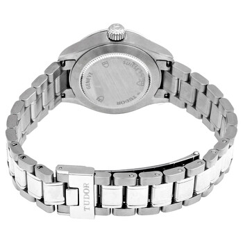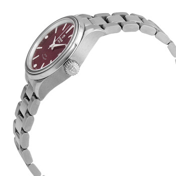 Stainless steel case with a stainless steel bracelet. Fixed stainless steel bezel. Burgundy dial with luminous silver-tone hands and index hour markers. Diamonds set at the 3, 6 and 9 o'clock positions. Minute markers around the outer rim. Dial Type: Analog. Date display at the 3 o'clock position. Tudor calibre T201 automatic movement, based upon ETA 2671, containing 25 Jewels, bitting at 28800 vph, and has a power reserve of approximately 38 hours. Scratch resistant sapphire crystal. Screw down crown. Solid case back. Round case shape. Case size: 28 mm. Fold over clasp with a safety release. Water resistant at 100 meters / 330 feet. Functions: date, hour, minute, second. Luxury watch style. Watch label: Swiss Made. Tudor Automatic Burgundy Diamond Dial Ladies Watch M12100-0015.