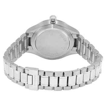 Stainless steel case with a stainless steel bracelet. Fixed fluted stainless steel bezel. Black dial with silver-tone hands and index hour markers. Diamonds set atthe 3, 6 and 9 o'clock positions. Dial Type: Analog. Date display at the 3 o'clock position. Tudor calibre T601 automatic movement, based upon ETA 2824, containing 25 Jewels, bitting at 28800 vph, and has a power reserve of approximately 38 hours. Scratch resistant sapphire crystal. Screw down crown. Round case shape. Case size: 34 mm. Fold over clasp. Water resistant at 100 meters / 330 feet. Functions: date, hour, minute, second. Dress watch style. Watch label: Swiss Made. Tudor Automatic Diamond Black Dial Ladies Watch M12310-0009.
