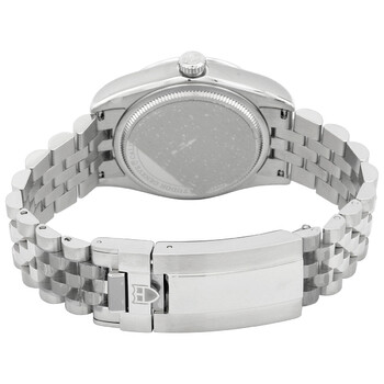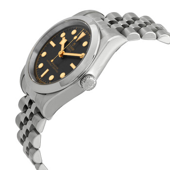 Silver-tone stainless steel case and bracelet. Fixed silver-tone stainless steel bezel. Anthracite dial with gold-tone hands and index hour markers. Minute markers around the outer rim. Dial Type: Analog. Luminescent hands and markers. Tudor Calibre MT5201 automatic movement. Scratch resistant sapphire crystal. Screw down crown. Round case shape, case size: 31 mm. Fold over clasp with a safety release. Water resistant at 100 meters / 330 feet. Functions: hour, minute, second, chronometer. Black Bay 31 Series. Luxury watch style. Watch label: Swiss Made. Tudor Black Bay 31 Automatic Chronometer Anthracite Dial Ladies Watch M79600-0001.