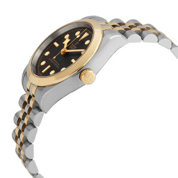 Silver-tone stainless steel case with a stainless steel and 18kt yellow gold bracelet. Fixed 18kt yellow gold bezel. Black dial with yellow gold-tone hands and index hour markers. Minute markers around the outer rim. Dial Type: Analog. Luminescent hands and markers. Tudor Calibre MT5201 automatic movement with a 50-hour power reserve. Scratch resistant sapphire crystal. Solid case back. Round case shape, case size: 31 mm. Folding clasp. Water resistant at 100 meters / 330 feet. Functions: hour, minute, second, chronometer. Black Bay 31 Series. Luxury watch style. Watch label: Swiss Made. Tudor Black Bay 31 Automatic Chronometer Black Dial Ladies Watch M79603-0001.