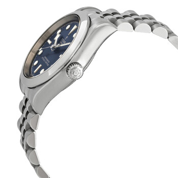 Silver-tone stainless steel case and bracelet. Fixed silver-tone stainless steel bezel. Blue dial with silver-tone hands and index hour markers. Minute markers around the outer rim. Dial Type: Analog. Luminescent hands and markers. Tudor Calibre MT5201 automatic movement. Scratch resistant sapphire crystal. Screw down crown. Round case shape, case size: 31 mm. Fold over clasp with a safety release. Water resistant at 100 meters / 330 feet. Functions: hour, minute, second, chronometer. Black Bay 31 Series. Luxury watch style. Watch label: Swiss Made. Tudor Black Bay 31 Automatic Chronometer Blue Dial Ladies Watch M79600-0002.