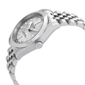 Silver-tone stainless steel case and bracelet. Fixed silver-tone stainless steel bezel. Light champagne dial with silver-tone hands and diamond hour markers. Index marker appears at the 3, 6, 9 and 12 o'clock positions. Minute markers around the outer rim. Dial Type: Analog. Luminescent hands and markers. Tudor Calibre MT5201 automatic movement with a 50-hour power reserve. Scratch resistant sapphire crystal. Screw down crown. Round case shape, case size: 31 mm. Fold over clasp with a safety release. Water resistant at 100 meters / 330 feet. Functions: hour, minute, second, chronometer. Black Bay 31 Series. Luxury watch style. Watch label: Swiss Made. Tudor Black Bay 31 Automatic Chronometer Diamond Champagne Dial Ladies Watch M79600-0006.