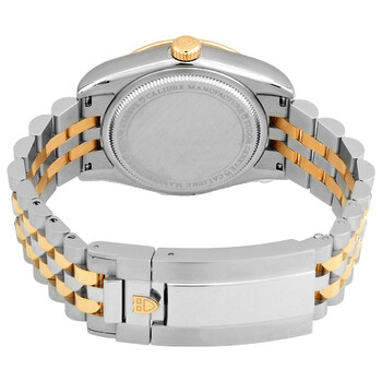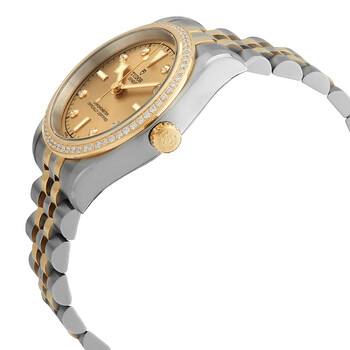 Silver-tone 316L stainless steel case with a two-tone (silver-tone and yellow gold ) stainless steel bracelet. Fixed gold-tone bezel with diamond set. Champagne dial with gold-tone hands and index-diamond hour markers. Minute markers around the outer rim. Dial Type: Analog. Luminescent hands and markers. Tudor Calibre MT5201 (COSC) automatic movement with a 50-hour power reserve. Scratch resistant sapphire crystal. Round case shape, case size: 31 mm. Fold over clasp. Water resistant at 100 meters / 330 feet. Functions: hour, minute, second. Black Bay Series. Dress watch style. Watch label: Swiss Made. Tudor Black Bay 31 S G Automatic Diamond Champagne Dial Men's Watch M79613-0007.