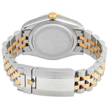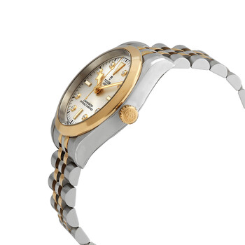Silver-tone stainless steel case with a stainless steel and 18kt yellow gold bracelet. Fixed 18kt yellow gold bezel. Silver dial with yellow gold-tone hands and diamond hour markers. Index markers at the 3, 6, 9 and 12 o'clock positions. Minute markers around the outer rim. Dial Type: Analog. Luminescent hands and markers. Tudor Calibre MT5400 Automatic movement, containing 27 Jewels, bitting at 28800 vph, and has a power reserve of approximately 70 hours. Scratch resistant sapphire crystal. Solid case back. Round case shape, case size: 36 mm. Folding clasp. Water resistant at 100 meters / 330 feet. Functions: hour, minute, second, chronometer. Black Bay 36 Series. Luxury watch style. Watch label: Swiss Made. Tudor Black Bay 36 Automatic Chronometer Diamond Silver Dial Unisex Watch M79643-0007.