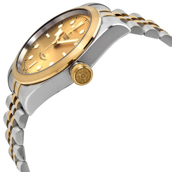 Stainless steel case with a stainless steel bracelet with 18kt yellow gold center links. Fixed 18kt yellow gold bezel. Champagne dial with luminous yellow gold-tone snowflake hands and dot hour markers. Minute markers around the outer rim. Dial Type: Analog. Luminescent hands and markers. Tudor calibre 2824 automatic movement, based upon ETA 2824, containing 25 Jewels, bitting at 28800 vph, and has a power reserve of approximately 38 hours. Scratch resistant sapphire crystal. Screw down crown. Solid case back. Round case shape. Case size: 41 mm. Fold over clasp. Water resistant at 150 meters / 500 feet. Functions: hour, minute, second. Luxury watch style. Watch label: Swiss Made. Tudor Black Bay 41 Automatic Champagne Dial Men's Watch M79543-0002.