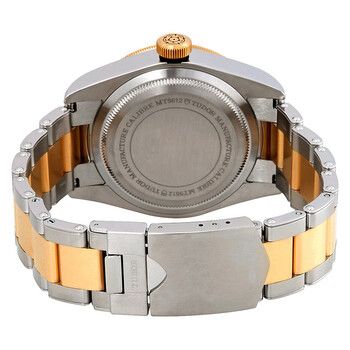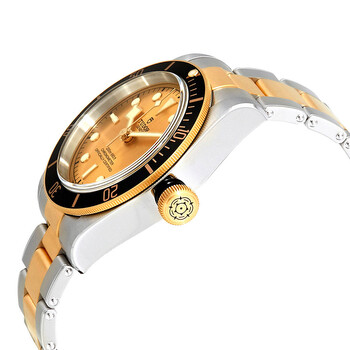Stainless steel case with a stainless steel bracelet with yellow gold center links. Uni-directional rotating yellow gold bezel with a black aluminium inlay. Champagne dial with luminous yellow gold-tone hands and dot hour markers. Minute markers around the outer rim. Dial Type: Analog. Luminescent hands and markers. Date display at the 3 o'clock position. Tudor calibre MT5612 automatic movement with a 70 mm power reserve. Scratch resistant sapphire crystal. Screw down crown. Solid case back. Round case shape. Case size: 41 mm. Bracelet width: 22 mm. Fold over clasp. Water resistant at 200 meters / 660 feet. Functions: date, hour, minute, second. Dress watch style. Watch label: Swiss Made. Tudor Black Bay Automatic 41 mm Champagne Dial Men's Watch M79733N-0004.