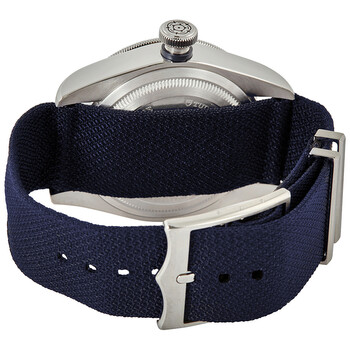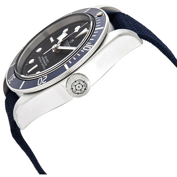 Stainless steel case with a blue fabric strap. Uni-directional rotating stainless steel bezel with a matt blue anodised aluminium. Black dial with luminous silver-tone hands and dot hour markers. Minute markers around the outer rim. Dial Type: Analog. Luminescent hands and markers. Tudor Calibre MT5602 Automatic movement, based upon Tudor MT5612, containing 26 Jewels, bitting at 28800 vph, and has a power reserve of approximately 70 hours. Scratch resistant sapphire crystal. Screw down crown. Solid case back. Round case shape. Case size: 41 mm. Case thickness: 13 mm. Band width: 22 mm. Tang clasp. Water resistant at 200 meters / 660 feet. Functions: hour, minute, second. Black Bay Series. Luxury watch style. Watch label: Swiss Made. Tudor Black Bay Automatic Black Dial Men's Watch M79230B-0006.