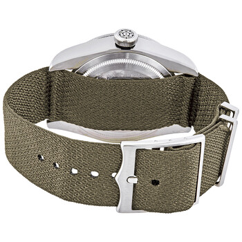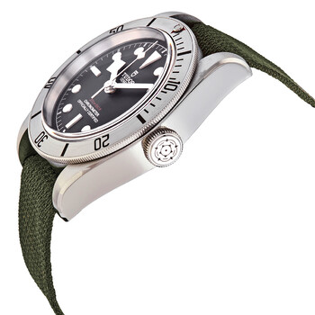 Stainless steel case with a green khaki fabric strap. Uni-directional rotating stainless steel bezel. Black dial with silver-tone snowflake-shape hands and dot hour markers. Minute markers around the outer rim. Dial Type: Analog. Luminescent hands and markers. Date display at the 3 o'clock position. Tudor calibre MT5612 automatic movement, containing 26 Jewels, bitting at 28800 vph, and has a power reserve of approximately 70 hours. Scratch resistant sapphire crystal. Screw down crown. Solid case back. Round case shape. Case size: 41 mm. Band width: 22 mm. Tang clasp. Water resistant at 200 meters / 660 feet. Functions: date, hour, minute, second, chronometer. Dive watch style. Watch label: Swiss Made. Tudor Black Bay Automatic Chronometer Black Dial 41 mm Men's Watch M79730-0004.