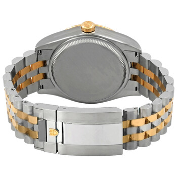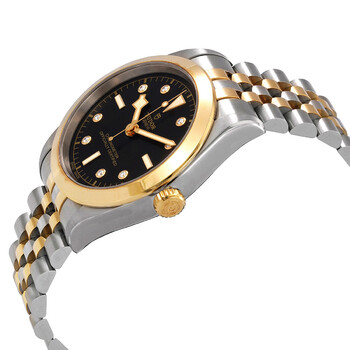 Silver-tone stainless steel case with a two-tone (silver-tone and yellow gold) stainless steel bracelet. Fixed yellow gold bezel. Black dial with yellow gold-tone hands and diamond hour markers. Minute markers around the outer rim. Dial Type: Analog. Luminescent hands and markers. Tudor Calibre MT5602 Automatic movement, based upon Tudor MT5612, containing 26 Jewels, bitting at 28800 vph, and has a power reserve of approximately 70 hours. Scratch resistant sapphire crystal. Screw down crown. Solid case back. Round case shape, case size: 39 mm. Folding clasp. Water resistant at 100 meters / 330 feet. Functions: hour, minute, second, chronometer. Black Bay Series. Luxury watch style. Watch label: Swiss Made. Item Variations: 79663-0006. Tudor Black Bay Automatic Chronometer Diamond Black Dial Men's Watch M79663-0006.