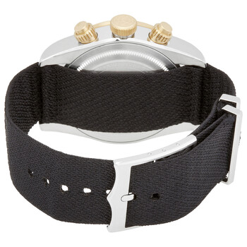 Stainless steel case with a black fabric strap. Fixed yellow gold bezel with a black aluminum ring showing tachymeter markings. Black dial with luminous gold-tone hands and dot hour markers. Minute markers around the outer rim. Dial Type: Analog. Date display at the 6 o'clock position. Chronograph - two gold sub-dials displaying: 60 second and 45 minute. Tudor calibre MT5813 automatic movement, based upon Breitling B01, containing 47 Jewels, bitting at 28800 vph, and has a power reserve of approximately 70 hours. Scratch resistant sapphire crystal. Screw down crown. Solid case back. Round case shape. Case size: 41 mm. Band width: 20 mm. Fold over clasp. Water resistant at 200 meters / 660 feet. Functions: chronograph, tachymeter, date, hour, minute, second. Luxury watch style. Watch label: Swiss Made. Tudor Black Bay Chronograph Automatic Black Dial Men's Watch M79363N-0003.