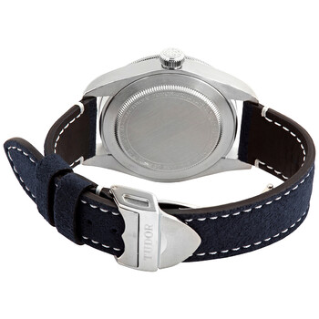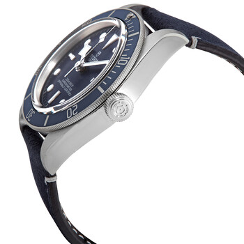 Stainless steel case with a blue (soft) leather strap. Uni-directional rotating stainless steel bezel with a blue (anodised) aluminium ring. Blue dial with luminous silver-tone hands and dot hour markers. Minute markers around the outer rim. Dial Type: Analog. Luminescent hands and markers. Tudor calibre MT5402 automatic movement, containing 27 Jewels, bitting at 28800 vph, and has a power reserve of approximately 70 hours. Scratch resistant sapphire crystal. Screw down crown. Solid case back. Round case shape. Case size: 39 mm. Case thickness: 11.9 mm. Band width: 20 mm. Fold over clasp. Water resistant at 200 meters / 660 feet. Functions: hour, minute, second. Black Bay Fifty-eight Series. Luxury watch style. Watch label: Swiss Made. Tudor Black Bay Fifty-Eight Automatic Blue Dial Men's Watch M79030B-0002.