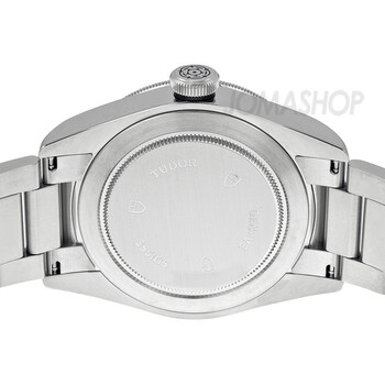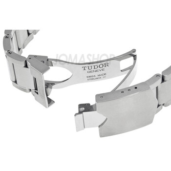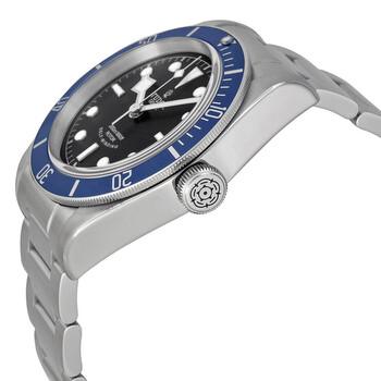 Silver-tone stainless steel case with a silver-tone stainless steel bracelet. Uni-directional rotating blue stainless steel bezel. Black dial with luminous silver-tone snowflake-shape hands and dot hour markers. Minute markers around the outer rim. Dial Type: Analog. Luminescent hands and markers. ETA Caliber 2824 automatic movement with a 38-hour power reserve. Scratch resistant sapphire crystal. Screw down crown. Solid case back. Round case shape. Case size: 40 mm. Deployment clasp. Water resistant at 200 meters / 660 feet. Functions: hour, minute, second. Dress watch style. Watch label: Swiss Made. Item Variations: 79220B BKSSS, 79220B.BKSSS, 79220BBKSSS. Tudor Black Bay Heritage Black Dial Men's Watch 79220B-BKSSS.