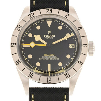 Silver-tone stainless steel case with a black canvas strap. Fixed silver-tone stainless steel bezel. Black dial with silver-tone hands and index hour markers. Minute markers around the outer rim. Dial Type: Analog. Luminescent hands and markers. Date display at the 3 o'clock position. Tudor Calibre MT5652 Automatic movement, containing 26 Jewels, bitting at 28800 vph, and has a power reserve of approximately 70 hours. Scratch resistant sapphire crystal. Screw down crown. Solid case back. Round case shape, case size: 39 mm. Tang clasp. Water resistant at 200 meters / 660 feet. Functions: date, GMT, second time zone, hour, minute, second, chronometer. Additional Info: original box, international warranty card, manual (complete accessories). Black Bay Pro Series. Luxury watch style. Watch label: Swiss Made. Tudor Black Bay Pro Automatic Chronometer Black Dial Men's Watch 79470-LS.