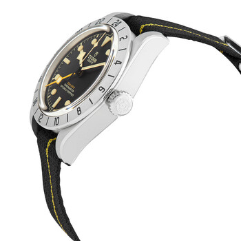Stainless steel case with a black fabric NATO strap. Fixed stainless steel showing 24 hour markings bezel. Black dial with luminous silver-tone hands and dot hour markers. Minute markers around the outer rim. Dial Type: Analog. Luminescent hands and markers. Date display at the 3 o'clock position. Tudor calibre MT5652 automatic movement, containing 26 Jewels, bitting at 28800 vph, and has a power reserve of approximately 70 hours. Scratch resistant sapphire crystal. Screw down crown. Solid case back. Round case shape. Case size: 39 mm. Tang clasp. Water resistant at 200 meters / 660 feet. Functions: date, GMT, second time zone, hour, minute, second, chronometer. Black Bay Pro Series. Luxury watch style. Watch label: Swiss Made. Tudor Black Bay Pro Automatic Chronometer Black Dial Men's Watch M79470-0002.
