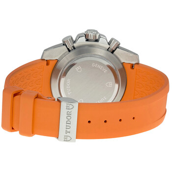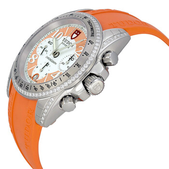 Stainless steel case with a orange rubber strap. Fixed stainless steel bezel set with diamonds with tachymeter markings. White and orange dial with luminous hands and alternating Arabic numeral and index hour markers. Minute markers around the outer rim. Dial Type: Analog. Date display at the 6 o'clock position. Chronograph - three sub-dials displaying: 60 second, 30 minute and 12 hour. Automatic movement. Scratch resistant sapphire crystal. Case diameter: 41 mm. Round case shape. Fold over clasp. Water resistant at 150 meters / 500 feet. Functions: chronograph, date, hour, minute, second. Luxury watch style. Watch label: Swiss Made. Tudor Chronograph Dial Diamond Orange Rubber Ladies Watch 20310-WOASORS.