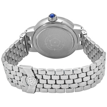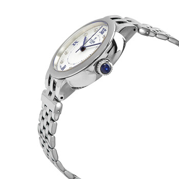 Silver-tone stainless steel case with a silver-tone stainless steel bracelet. Fixed silver-tone stainless steel bezel. Opaline dial with blue sword-shaped hands and Roman numeral and diamond hour markers. Minute scale around the inner rim. Dial Type: Analog. Date display at the 3 o'clock position. Tudor Calibre 2824 Automatic movement, based upon ETA 2824, containing 25 Jewels, bitting at 28800 vph, and has a power reserve of approximately 38 hours. Scratch resistant sapphire crystal. Screw down crown. Solid case back. Round case shape. Case size: 34 mm. Folding clasp. Water resistant at 100 meters / 330 feet. Functions: date, hour, minute, second. Dress watch style. Watch label: Swiss Made. Tudor Claire de Rose Automatic Diamond Ladies Watch M35800-0004.