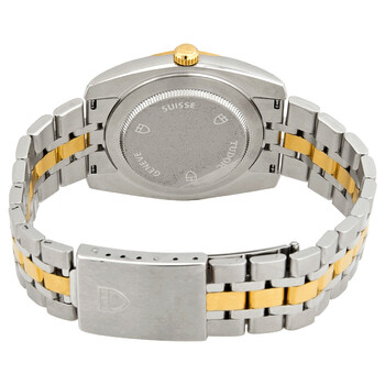 Stainless steel case with a stainless steel bracelet with yellow gold links. Fixed yellow gold bezel set with diamonds. Champagne dial with luminous yellow gold-tone hands and index hour markers. Minute markers around the outer rim. Dial Type: Analog. Luminescent hands. Date display at the 3 o'clock position. ETA caliber 2824-2 automatic movement, based upon ETA 2824, containing 25 Jewels, bitting at 28800 vph, and has a power reserve of approximately 38 hours. Scratch resistant sapphire crystal. Screw down crown. Solid case back. Round case shape. Case size: 38 mm. Fold over clasp with a safety release. Water resistant at 100 meters / 330 feet. Functions: date, hour, minute, second. Classic Series. Dress watch style. Watch label: Swiss Made. Tudor Classic Automatic Diamond Champagne Dial Men's Watch M21023-0009.
