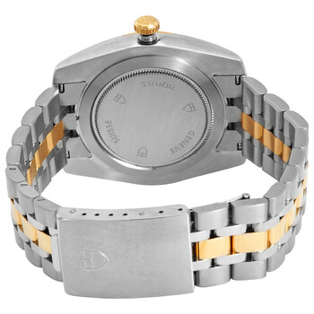 Stainless steel case with a stainless steel bracelet with 18kt yellow gold links. Fixed 18kt yellow gold bezel. Silver dial with luminos yellow gold-tone hands and diamond hour markers. Minute markers around the outer rim. Dial Type: Analog. Date display at the 3 o'clock position. Day of the week display centered on the 12 o'clock position. Tudor calibre 2834 automatic movement, based upon ETA 2834, containing 25 Jewels, bitting at 28800 vph, and has a power reserve of approximately 38 hours. Scratch resistant sapphire crystal. Screw down crown. Solid case back. Round case shape. Case size: 40 mm. Fold over clasp with a safety release. Water resistant at 100 meters / 330 feet. Functions: date, hour, minute, second. Date And Day Classic Series. Luxury watch style. Watch label: Swiss Made. Tudor Date and Day Classic Automatic Diamond Silver Dial Men's Watch 23013-0016.