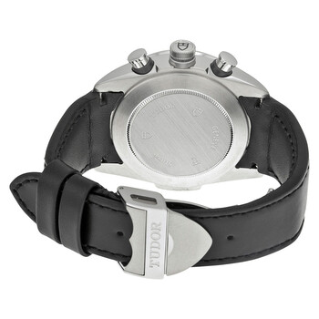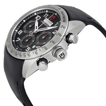 Silver-tone stainless steel case with a black leather strap. Fixed tachymeter scale silver-tone stainless steel bezel. Black dial with luminous hands and Arabic numeral hour markers. Minute markers around the outer rim. Dial Type: Analog. Luminescent hands and markers. Date display between 4 and 5 o'clock position. Chronograph - three sub-dials displaying: 60 second, 30 minute and 12 hour. ETA-Valjoux Caliber 7753 Automatic movement, based upon ETA 7750, containing 27 Jewels, bitting at 28800 vph, and has a power reserve of approximately 44 hours. Scratch resistant sapphire crystal. Screw down crown. Solid case back. Round case shape, case size: 42 mm. Deployment clasp. Water resistant at 150 meters / 500 feet. Functions: chronograph, date, hour, minute, second. Fastrider Series. Luxury watch style. Watch label: Swiss Made. Item Variations: 42000-blackleather-blackarabic. Tudor Fastrider Black Dial Chronograph Black Leather Men's Watch 42000-BKABKLS.