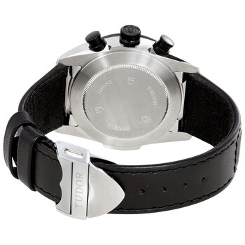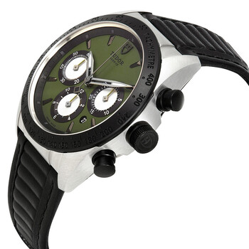 Stainless steel case with a black leather strap. Fixed black ceramic bezel showing tachymeter markers. Green dial with luminous black hands and index hour markers. Minute markers around the outer rim. Dial Type: Analog. Luminescent hands. Date display between the 4 and 5 o'clock positions. Chronograph - three white sub-dials displaying: 60 second, 30 minute and 12 hour. ETA-Valjoux caliber 7753 automatic movement, based upon ETA 7750, containing 27 Jewels, bitting at 28800 vph, and has a power reserve of approximately 44 hours. Scratch resistant sapphire crystal. Screw down crown. Solid case back. Round case shape. Case size: 42 mm. Case thickness: 15 mm. Band width: 20 mm. Deployment clasp with a push button release. Water resistant at 150 meters / 500 feet. Functions: chronograph, tachymeter date, hour, minute, second. Fastrider Series. Luxury watch style. Watch label: Swiss Made. Item Variations: 42010n-0004. Tudor Fastrider Chronograph Automatic Green Dial Men's Watch 42010N-0004.