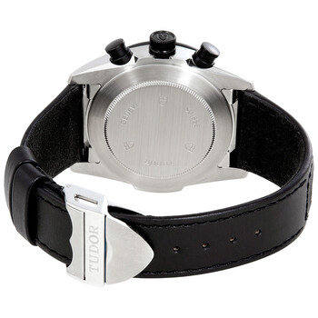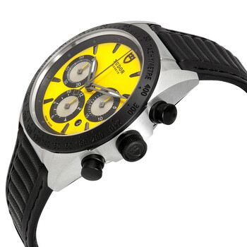 Stainless steel case with a black leather strap. Fixed black ceramic bezel showing tachymeter markers. Yellow dial with luminous black hands and index hour markers. Minute markers around the outer rim. Dial Type: Analog. Luminescent hands. Date display between the 4 and 5 o'clock positions. Chronograph - three white sub-dials displaying: 60 second, 30 minute and 12 hour. ETA-Valjoux caliber 7753 automatic movement, based upon ETA 7750, containing 27 Jewels, bitting at 28800 vph, and has a power reserve of approximately 44 hours. Scratch resistant sapphire crystal. Screw down crown. Solid case back. Round case shape. Case size: 42 mm. Case thickness: 15 mm. Band width: 20 mm. Deployment clasp with a push button release. Water resistant at 150 meters / 500 feet. Functions: chronograph, tachymeter date, hour, minute, second. Fastrider Series. Luxury watch style. Watch label: Swiss Made. Item Variations: 42010n-0002. Tudor Fastrider Chronograph Automatic Yellow Dial Men's Watch 42010N-0002.