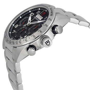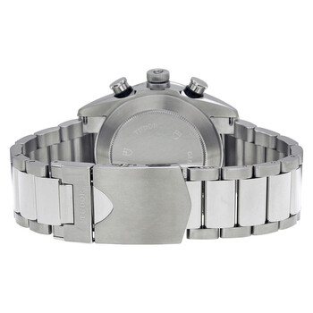 Stainless steel case with a stainless steel bracelet. Fixed stainless steel bezel with tachymeter. Black dial with luminous silver-tone hands and Arabic numeral hour markers. Minute markers around the outer rim. Dial Type: Analog. Luminescent hands and markers. Date display between 4 and 5 o'clock positions. Chronograph - three sub-dials displaying: 60 second, 30 minute and 12 hour. Self winding automatic movement with a 46 hour power reserve. Scratch resistant sapphire crystal. Screw down crown. Solid case back. Case diameter: 42 mm. Round case shape. Fold over clasp. Water resistant at 500 meters / 1650 feet. Functions: chronograph, date, hour, minute, second. Dress watch style. Watch label: Swiss Made. Tudor Fastrider Chronograph Black Dial Stainless Steel Men's Watch 42000-95730.