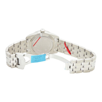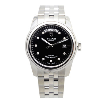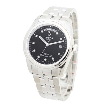Silver-tone stainless steel case with a silver-tone stainless steel bracelet. Fixed silver-tone stainless steel bezel. Black dial with silver-tone hands and diamond hour markers. Minute markers around the outer rim. Dial Type: Analog. Luminescent hands. Date display at the 3 o'clock position. Automatic movement. Scratch resistant sapphire crystal. Solid case back. Round case shape. Case size: 39 mm. Fold over clasp. Functions: date, day, hour, minute, second. Additional Info: original box, international warranty card, manual (complete accessories). Luxury watch style. Watch label: Swiss Made. Tudor Glamour Date Automatic Diamond Black Dial Watch 56000-68060-10DI-BK.