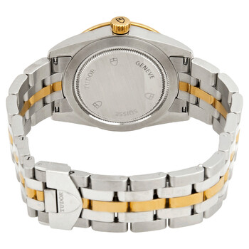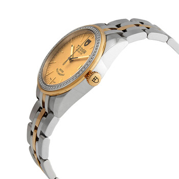 Stainless steel case with a stainless steel bracelet with yellow gold links. Fixed stainless steel and yellow gold double bezel set with diamonds. Champagne jacquard dial with luminous yellow gold-tone hands and index hour markers. Minute markers around the outer rim. Dial Type: Analog. Date display at the 3 o'clock position. Tudor calibre T601 automatic movement, based upon ETA 2824, containing 25 Jewels, bitting at 28800 vph, and has a power reserve of approximately 38 hours. Scratch resistant sapphire crystal. Screw down crown. Solid case back. Round case shape. Case size: 36 mm. Fold over clasp with a safety release. Water resistant at 100 meters / 330 feet. Functions: date, hour, minute, second. Glamour Date Series. Dress watch style. Watch label: Swiss Made. Tudor Glamour Date Automatic Diamond Champagne Jacquard Dial Ladies Watch M55023-0027.