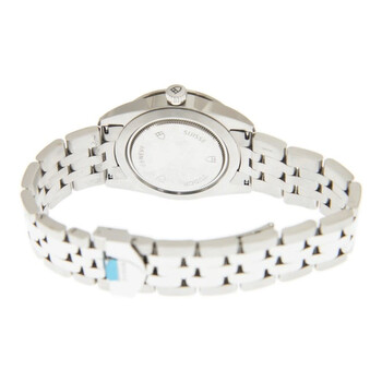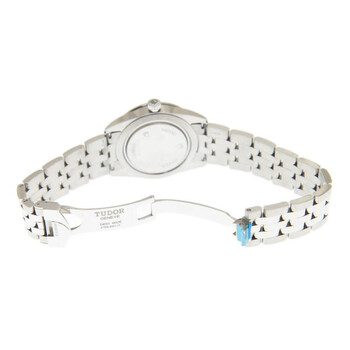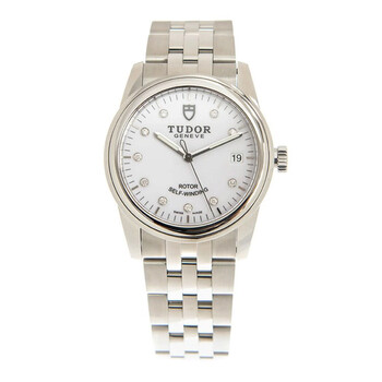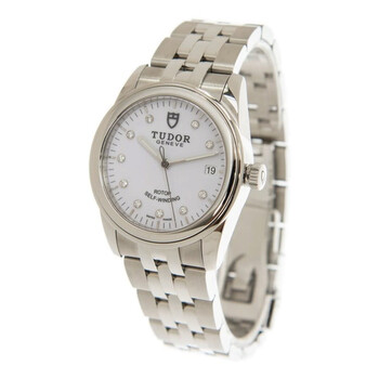 Silver-tone stainless steel case and bracelet. Fixed silver-tone stainless steel bezel. White dial with silver-tone hands and diamond hour markers. Minute markers around the outer rim. Dial Type: Analog. Luminescent hands. Date display at the 3 o'clock position. Tudor Calibre 2824 Automatic movement, based upon ETA 2824, containing 25 Jewels, bitting at 28800 vph, and has a power reserve of approximately 38 hours. Scratch resistant sapphire crystal. Screw down crown. Solid case back. Round case shape, case size: 36 mm. Fold over clasp. Water resistant at 100 meters / 330 feet. Functions: date, hour, minute, second. Additional Info: original box, international warranty card, manual (complete accessories). Glamour Date Series. Luxury watch style. Watch label: Swiss Made. Tudor Glamour Date Automatic Diamond White Dial Unisex Watch 55000-68050-10DI-WT.