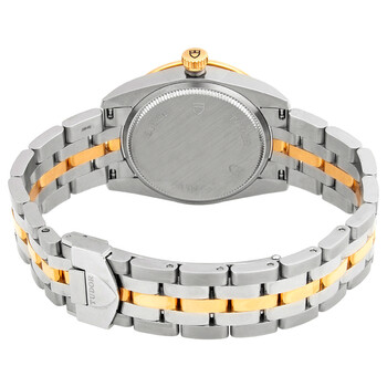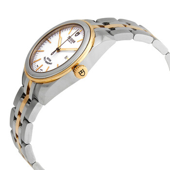 Stainless steel case with a stainless steel bracelet with yellow gold center links. Fixed stainless steel and yellow gold bezel. White dial with yellow gold-tone hands and index hour markers. Minute markers around the outer rim. Dial Type: Analog. Date display at the 3 o'clock position. Tudor calibre T201 automatic movement, based upon ETA 2671, containing 25 Jewels, bitting at 28800 vph, and has a power reserve of approximately 38 hours. Scratch resistant sapphire crystal. Solid case back. Round case shape. Case size: 36 mm. Fold over clasp with a safety release. Water resistant at 100 meters / 330 feet. Functions: date, hour, minute, second. Glamour Date Series. Luxury watch style. Watch label: Swiss Made. Tudor Glamour Date Automatic White Dial Ladies Watch 53003-0001.