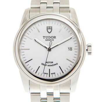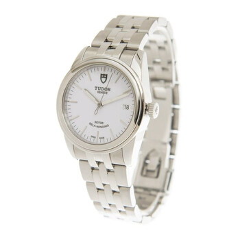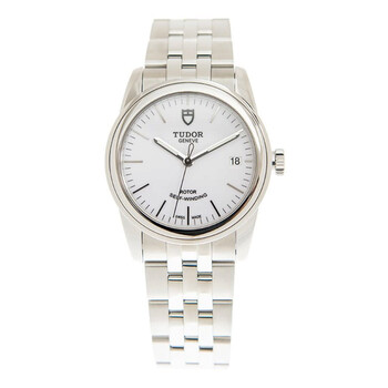 Silver-tone stainless steel case and bracelet. Fixed silver-tone stainless steel bezel. White dial with silver-tone hands and index hour markers. Minute markers around the outer rim. Dial Type: Analog. Luminescent hands. Date display at the 3 o'clock position. Tudor Calibre 2824 Automatic movement, based upon ETA 2824, containing 25 Jewels, bitting at 28800 vph, and has a power reserve of approximately 38 hours. Scratch resistant sapphire crystal. Screw down crown. Solid case back. Round case shape, case size: 36 mm. Fold over clasp. Water resistant at 100 meters / 330 feet. Functions: date, hour, minute, second. Additional Info: original box, international warranty card, manual (complete accessories). Glamour Date Series. Luxury watch style. Watch label: Swiss Made. Tudor Glamour Date Automatic White Dial Unisex Watch 55000-68050-WT.