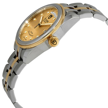 Stainless steel case with a stainless steel bracelet with 18kt yellow gold links. Fixed 18kt yellow gold bezel with a stainless steel ring. Gold dial with gold-tone hands and diamond hour markers. Minute markers around the outer rim. Dial Type: Analog. Luminescent hands. Date display at the 3 o'clock position. Day of the week displayed at the 12 o'clock position. ETA caliber 2834-2 automatic movement, containing 25 Jewels, bitting at 28800 vph, and has a power reserve of approximately 38 hours. Scratch resistant sapphire crystal. Screw down crown. Solid case back. Round case shape. Case size: 39 mm. Band width: 20 mm. Fold over clasp with a safety release. Water resistant at 100 meters / 330 feet. Functions: date, day, hour, minute, second. Dress watch style. Watch label: Swiss Made. Tudor Glamour Day Date Automatic Diamond Gold Dial 39 mm Unisex Watch M56003-0006.