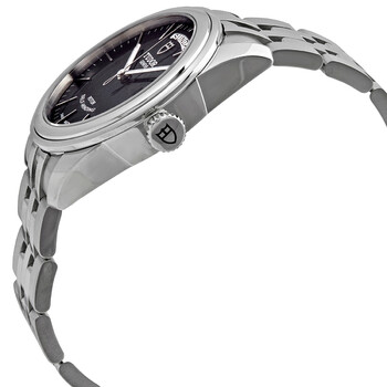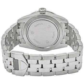 Stainless steel case with a stainless steel bracelet. Fixed stainless steel bezel. Black dial with luminous silver-tone hands and index hour markers. Minute markers around the outer rim. Dial Type: Analog. Luminescent hands. Date display at the 3 o'clock position. Day of the week display centered on the 12 o'clock position. ETA caliber 2834-2 automatic movement, containing 25 Jewels, bitting at 28800 vph, and has a power reserve of approximately 38 hours. Scratch resistant sapphire crystal. Screw down crown. Solid case back. Round case shape. Case size: 39 mm. Band width: 20 mm. Fold over clasp with a safety release. Water resistant at 100 meters / 330 feet. Functions: date, day, hour, minute, second. Luxury watch style. Watch label: Swiss Movt. Tudor Glamour Day-Date Automatic Black Dial 39 mm Watch M56000-0007.