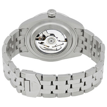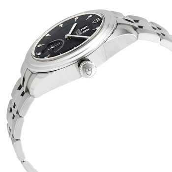 Stainless steel case with a stainless steel bracelet. Fixed stainless steel bezel. Black dial with luminous silver-tone hands and diamond hour markers. Minute markers around the outer rim. Dial Type: Analog. Luminescent hands. Double date display below the 12 o'clock position. Small second sub-dials. Tudor calibre MT5641 automatic movement, containing 32 Jewels, bitting at 28800 vph, and has a power reserve of approximately 70 hours. Scratch resistant sapphire crystal. Screw down crown. Transparent case back. Round case shape. Case size: 42 mm. Band width: 22 mm. Fold over with safety release clasp. Water resistant at 100 meters / 330 feet. Functions: big date, hour, minute, small second, chronometer. Luxury watch style. Watch label: Swiss Made. Tudor Glamour Double Date Automatic Diamond Black Dial Men's Watch M57100-0004.