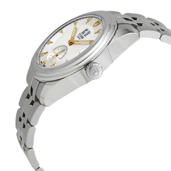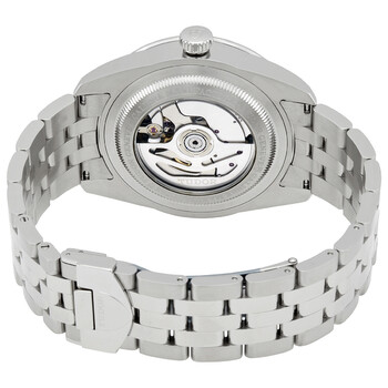 Stainless steel case with a stainless steel bracelet. Fixed stainless steel bezel. Silver dial with luminous gold-tone hands and diamond hour markers. Minute markers around the outer rim. Dial Type: Analog. Luminescent hands. Double date display below the 12 o'clock position. Small seconds sub-dial. Tudor calibre MT5641 automatic movement, containing 32 Jewels, bitting at 28800 vph, and has a power reserve of approximately 70 hours. Scratch resistant sapphire crystal. Screw down crown. Transparent case back. Round case shape. Case size: 42 mm. Band width: 22 mm. Fold over clasp with a safety release. Water resistant at 100 meters / 330 feet. Functions: big date, hour, minute, small second, chronometer. Glamour Double Date Series. Luxury watch style. Watch label: Swiss Made. Tudor Glamour Double Date Automatic Diamond Silver Dial Men's 42 mm Watch M57100-0005.