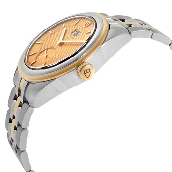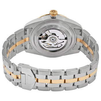 Stainless steel case with a stainless steel bracelet with yellow gold center links. Fixed stainless steel and yellow gold bezel. Gold dial with luminous yellow gold-plated hands and index hour markers. Minute markers around the outer rim. Dial Type: Analog. Luminescent hands. Double date display below the 12 o'clock position. Small seconds sub-dial. Tudor calibre MT5641 automatic movement, containing 32 Jewels, bitting at 28800 vph, and has a power reserve of approximately 70 hours. Scratch resistant sapphire crystal. Screw down crown. Transparent case back. Round case shape. Case size: 42 mm. Band width: 22 mm. Fold over clasp with a safety release. Water resistant at 100 meters / 330 feet. Functions: big date, hour, minute, small second, chronometer. Glamour Double Date Series. Luxury watch style. Watch label: Swiss Made. Tudor Glamour Double Date Automatic Gold Dial Men's 42 mm Watch M57103-0003.