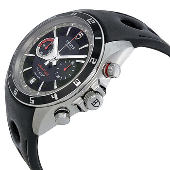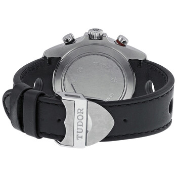 Silver-tone stainless steel case with a black large perforated leather strap. Fixed arabic numeral stainless steel bezel with a lacquered black top ring. Black dial with luminous hands and index hour markers. Minute markers around the outer rim. Dial Type: Analog. Luminescent hands and markers. Date display at the 6 o'clock position. Chronograph - two sub-dials displaying: 60 second and 30 minute. Tudor Calibre 2892 Chronograph Automatic movement, based upon ETA 2892, containing 21 Jewels, bitting at 28800 vph, and has a power reserve of approximately 42 hours. Scratch resistant sapphire crystal. Screw down crown. Solid case back. Round case shape, case size: 42 mm. Fold over clasp. Water resistant at 150 meters / 500 feet. Functions: chronograph, flyback, date, hour, minute, second. Grantour Chrono Fly-back Series. Luxury watch style. Watch label: Swiss Made. Item Variations: 20550N BKLPL, 20550N.BKLPL, 20550NBKLPL. Tudor Grantour Chrono Fly-Back Black Dial Men's Watch 20550N-BKLPL.