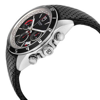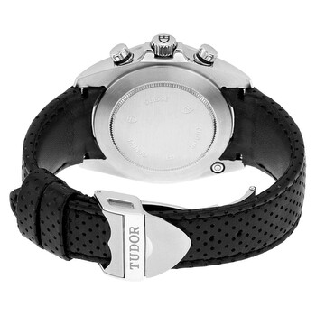 Stainless steel case with a black micro-perforated leather strap. Fixed stainless steel bezel with a black top ring. Black dial with luminous silver-tone hands and index hour markers. Minute markers around the outer rim. Dial Type: Analog. Date display between 4 and 5 o'clock position. Chronograph - three sub-dials displaying: 60 second, 30 minute and 12 hour. Automatic movement. Scratch resistant sapphire crystal. Solid case back. Case diameter: 42 mm. Round case shape. Lift clasp. Water resistant at 150 meters / 500 feet. Functions: chronograph, date, hour, minute, second. Luxury watch style. Watch label: Swiss Made. Tudor Grantour Chronograph Automatic Black Dial Black Leather Men's Watch 20530N-BKMCPL.