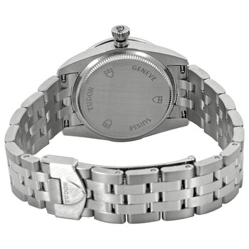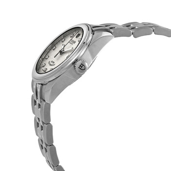 Stainless steel case with a stainless steel bracelet. Fixed stainless steel bezel. Silver jacquard dial with luminous silver-tone hands and diamond hour markers. Minute markers around the outer rim. Dial Type: Analog. Luminescent hands. Date display at the 3 o'clock position. Caliber calibre T201 hand wind movement with a 38-hour power reserve. Scratch resistant sapphire crystal. Screw down crown. Solid case back. Round case shape. Case size: 31 mm. Fold over clasp with a safety release. Water resistant at 100 meters / 330 feet. Functions: date, hour, minute, second. Dress watch style. Watch label: Swiss Made. Tudor Hand Wind Diamond Silver Jacquard Dial Ladies Watch M53000-0009.