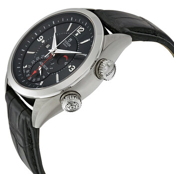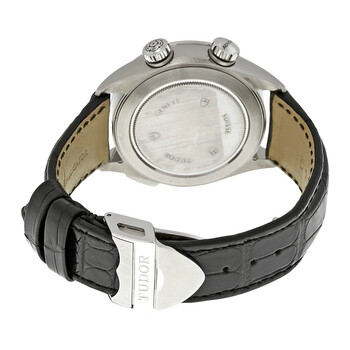 Stainless steel case with a black leather strap. Fixed stainless steel bezel. Black dial with silver-tone dauphine-style shape hands and index hour markers. Arabic numerals mark the 3, 9 and 12 o'clock positions. minute markers around the outer rim. Dial Type: Analog. Luminescent hands and markers. Date display at the 6 o'clock position. Two sub-dials displaying: date and alarm power reserve indicator. Tudor Calibre 2892-901 Automatic movement, based upon ETA 2892, containing 21 Jewels, bitting at 28800 vph, and has a power reserve of approximately 42 hours. Scratch resistant sapphire crystal. Screw down crown. Solid case back. Round case shape, case size: 42 mm. Deployment clasp. Water resistant at 100 meters / 330 feet. Functions: alarm, date, hour, minute, second, power reserve indicator. Heritage Series. Luxury watch style. Watch label: Swiss Made. Item Variations: 79620TN-alligator. Tudor Heriatge Advisor Black Dial Leather Men's Watch 79620TN-BKLS.