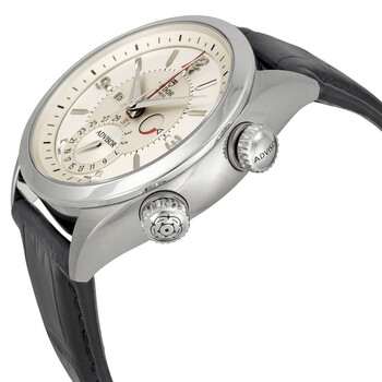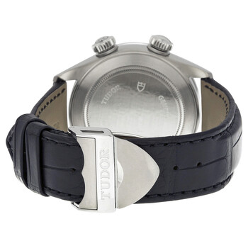 Grey titanium case with a black leather strap. Fixed grey titanium bezel. Cream dial with silver-tone hands and index hour markers. Arabic numerals mark the 3, 9 and 12 o'clock positions. minute markers around the outer rim. Dial Type: Analog. Luminescent hands and markers. Date display at the 6 o'clock position. Two sub-dials displaying: date and alarm power reserve indicator. Tudor Calibre 2892-901 Automatic movement, based upon ETA 2892, containing 21 Jewels, bitting at 28800 vph, and has a power reserve of approximately 42 hours. Scratch resistant sapphire crystal. Screw down crown. Solid case back. Round case shape, case size: 42 mm. Slip through clasp. Water resistant at 100 meters / 330 feet. Functions: alarm, date, hour, minute, second, power reserve indicator. Additional Info: watch supplied with additional black fabric strap. Heritage Advisor Series. Dress watch style. Watch label: Swiss Made. Item Variations: 79620T SVLS, 79620T.SVLS, 79620TSVLS. Tudor Heritage Advisor Cream Dial Black Leather Men's Watch 79620T-SVLS.