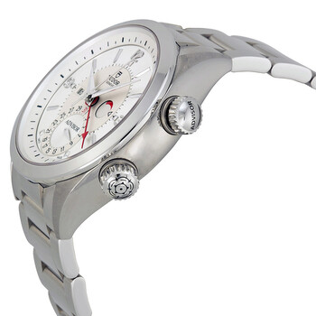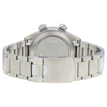 Titanium and stainless steel case with a silver-tone stainless steel bracelet. Fixed grey titanium bezel. Silver dial with silver-tone hands and index hour markers. Arabic numerals mark the 3, 9 and 12 o'clock positions. minute markers around the outer rim. Dial Type: Analog. Luminescent hands and markers. Date display at the 6 o'clock position. Two sub-dials displaying: date at the 6 o'clock position, alarm on/off indicator, power reserve indicator at the 3 o'clock position. Tudor Calibre 2892-901 Automatic movement, based upon ETA 2892, containing 21 Jewels, bitting at 28800 vph, and has a power reserve of approximately 42 hours. Scratch resistant sapphire crystal. Screw down crown. Solid case back. Round case shape, case size: 42 mm. Fold over clasp. Water resistant at 100 meters / 330 feet. Functions: alarm, date, hour, minute, second, power reserve indicator. Additional Info: watch supplied with additional black fabric strap with buckle. Heritage Advisor Series. Luxury watch style. Watch label: Swiss Made. Item Variations: 79620T-95740. Tudor Heritage Advisor Silver Dial Stainless Steel Men's Watch 79620T-95740.