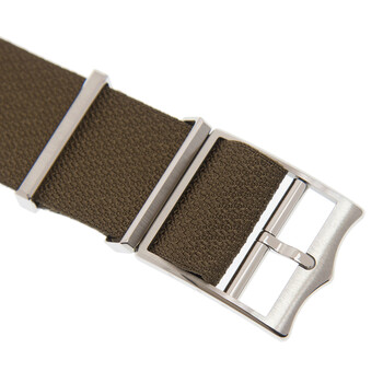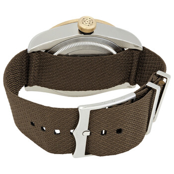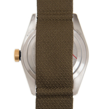 Stainless steel case with a green canvas strap. Uni-directional rotating gold bezel with a black aluminium ring. Black dial with luminous gold-tone snowflake hands and dot hour markers. Minute markers around the outer rim. Dial Type: Analog. Luminescent hands and markers. Date display at the 3 o'clock position. Tudor calibre MT5612 automatic movement, containing 26 Jewels, bitting at 28800 vph, and has a power reserve of approximately 70 hours. Scratch resistant sapphire crystal. Screw down crown. Solid case back. Round case shape. Case size: 41 mm. Band width: 20 mm. Tang clasp. Water resistant at 200 meters / 660 feet. Functions: date, hour, minute, second, chronometer. Casual watch style. Watch label: Swiss Made. Tudor Heritage Black Bay Automatic 41 mm Chronometer Black Dial Men's Watch 79733n-0005.