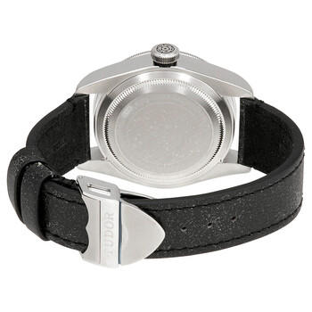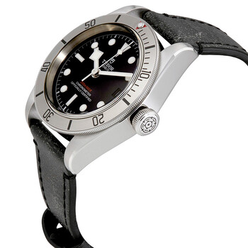 Stainless steel case with a black (aged) leather strap. Uni-directional rotating silver-tone stainless steel bezel. Black dial with silver-tone snowflake hands and dot hour markers. Minute markers around the outer rim. Dial Type: Analog. Luminescent hands and markers. Date display at the 3 o'clock position. Tudor calibre MT5612 automatic movement, containing 26 Jewels, bitting at 28800 vph, and has a power reserve of approximately 70 hours. Scratch resistant sapphire crystal. Screw down crown. Solid case back. Round case shape. Case size: 41 mm. Band width: 20 mm. Fold through clasp. Water resistant at 200 meters / 660 feet. Functions: date, hour, minute, second, chronometer. Dress watch style. Watch label: Swiss Made. Tudor Heritage Black Bay Automatic Chronometer Black Dial Men's Watch M79730-0005.
